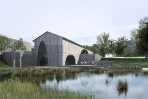Une charpente d’épicéa en lamellé-collé se déploie, révélant un espace fonctionnel et agréable. Sa forme arrondie nous renvoie au cœur du processus : la fabrication des tonneaux. À l’intérieur, la voûte domine. Ornée d’une résille bois, l’ensemble rythme l’espace tout en accentuant la courbe du bâti.